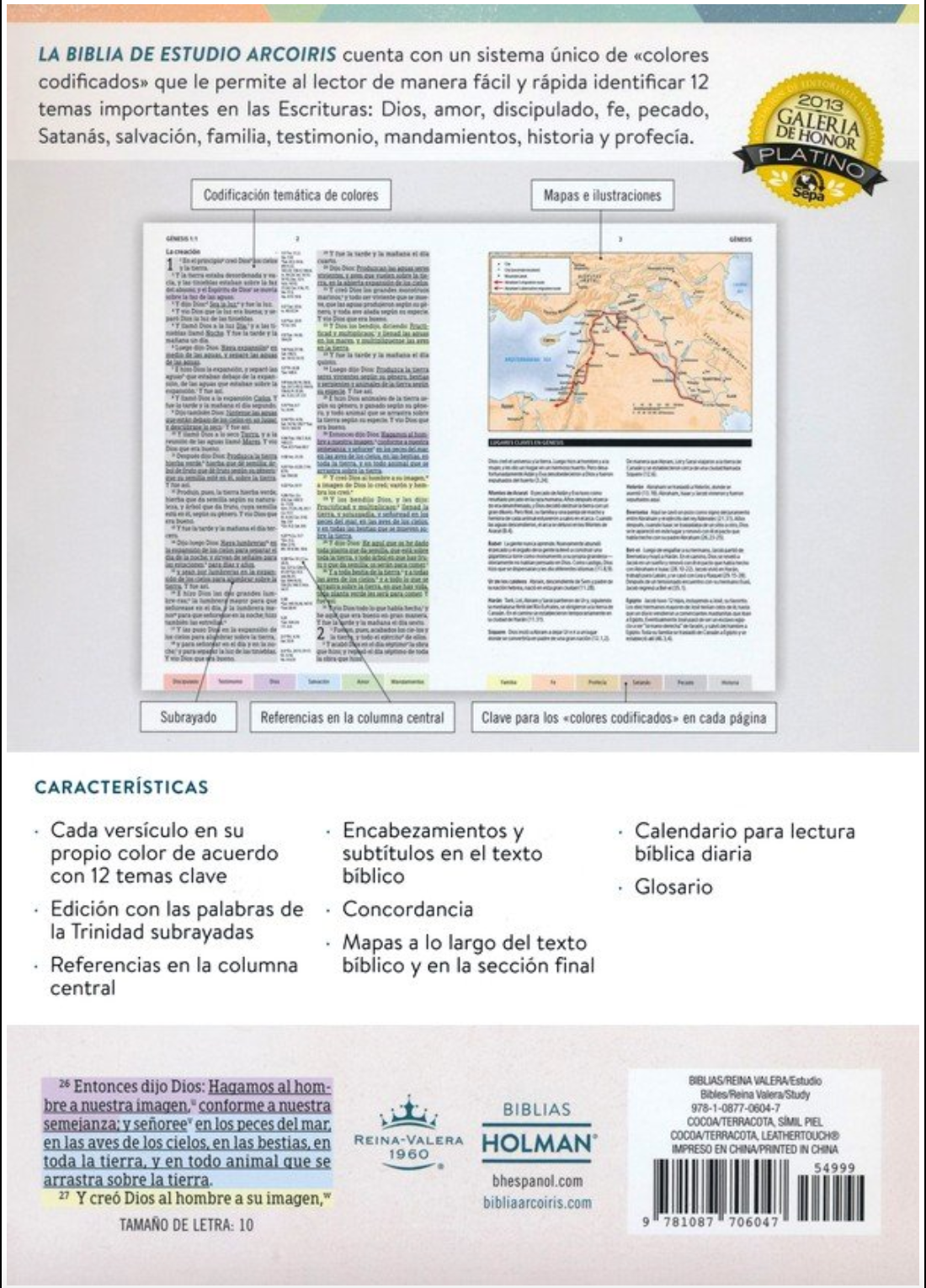 The RVR 1960 Rainbow Study Bible has a unique color-coding system that allows the readers to quickly and easily identify twelve major themes on Scripture throughout the text: God, love, discipleship, faith, sin, evil, salvation, family, outreach, commandments, history and prophecy.
