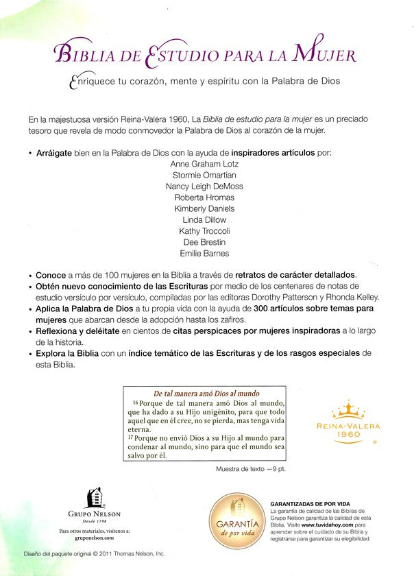 - Obtén nuevo conocimiento de las Escrituras por medio de los centenares de notas de estudio versículo por versículo, compiladas por las editoras Dorothy Patterson y Rhonda Kelley.