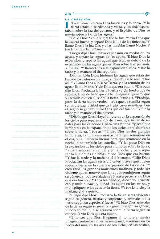 - Amplios márgenes que facilitan la toma de notas, pensamientos y oraciones, o dibujar los versículos favoritos.