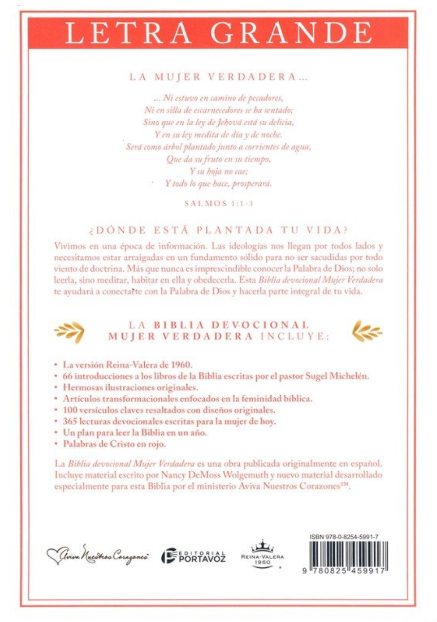 Esta Biblia ayudará a que las mujeres se conecten con la Palabra de Dios y la hagan parte integral de sus vidas, a través de ayudas como: 66 introducciones a los libros de la Biblia escritas por el pastor Sugel Michelén, Texto en letra grande, Artículos transformacionales enfocados en la feminidad bíblica, 365 lecturas devocionales escritas para la mujer de hoy. Texto bíblico en la versión Reina Valera 1960.