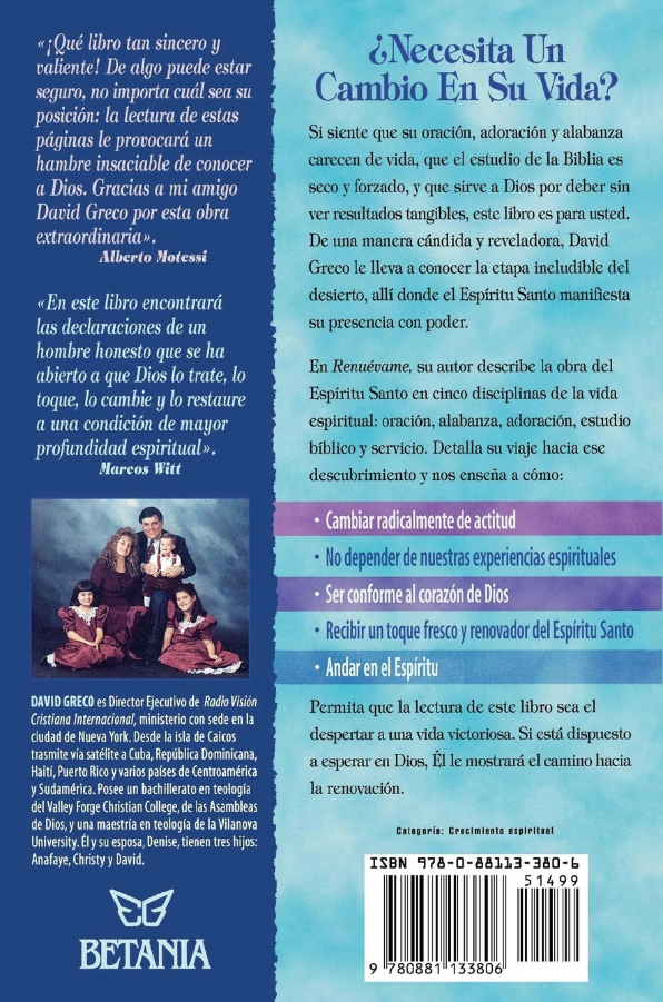 En Renuévame, su autor describe la obra del Espíritu Santo en cinco disciplinas de la vida espiritual: oración, alabanza, adoración, estudio bíblico y servicio.